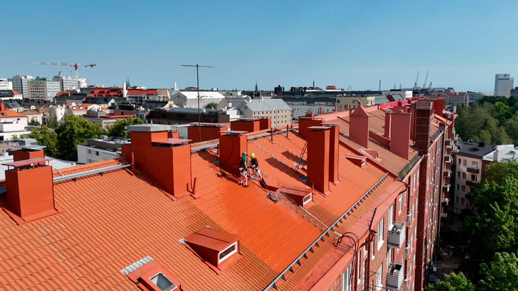 Mechelininkadun punaiset tiilitalot ovat monelle helsinkiläisille tuttu osa katukuvaa. As Oy Mechelininkatu 8:n tiilikatto oli parhaat päivänsä nähnyt. Väriset Oy puhdisti ja pinnoitti seitsenkerroksisen kerrostalon katot kesällä 2025.